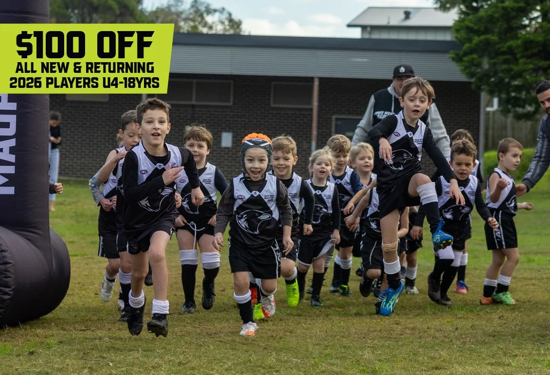 Our junior football program gives young athletes the opportunity to play in official AFL competitions, represent the club, and continue developing their skills as they progress through each age group. Players build resilience, teamwork, and footy smarts in a positive and inclusive environment. Whether they're new to the game or seasoned players, every child is supported, challenged, and encouraged to be their best.
